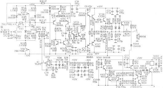 V4、VR和R9接在V3、V5集电极之间构成Vbe扩大电,调节VR可改变末级大功率管的静态工作电流。V4还起度补偿作用,当功率管的温度升高时,V4的发射结压降小,于是V4的集电极一发射极电压也降低,从而降低了功管的静态电流,作用与二极管相似,但比二极管更灵,安装时应与功率管一起装在散热器上,电气上要绝。