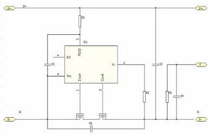 保护板有两个核心部件:一块保护IC,它是由精确的比较器来获得可靠的保护参数;另外是MOSFET串在主充放电回路中担当高速开关,执行保护动作。电路原理图如下: