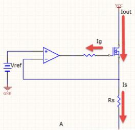 采样电阻Rs、运放构成一比较放大电路,MOS管输出回路的电流经RS转换成电压后,反馈到运放反向端实现控制vgs,从而MOS管输出回路的电流。当给定一个电压VREF时,如果Rs上的电压小于 VREF,也就是 运放的-IN小于+IN,运放加大输出,使MOS导通程度加深,使MOS管输出回路电流加大。如果 Rs 上的电压大于 VREF时,-IN大于+IN,运放减小输出,也就MOS管输出回路电流,这样电路最终维持在恒定的给值上,也就实现了恒流工作。