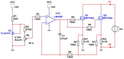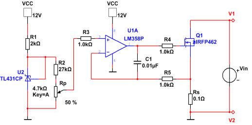 基本原理:MOS和电阻Rs组成负反馈电路,MOS管工作在恒流区,运放同相端调节设定恒流值,MOS管的电流在电阻Rs上产生压降,反馈到运放反向端实现控制输出电流。R1、U2构成一2.5V基准电压源,R2、Rp对这2.5V电压分压得到一参考电压送入运放同相端,MOS管输出回路的电流Is经Rs转换成电压后,反馈到运放反向端实现控制vgs,从而控制MOS管输出回路的电流Is的稳定。电容C1主要作用有2个,一方面是消杂波,另一方面也是对运放输出的梯波进行补偿,使得电压变化速度减缓,尽量减少mosfet的G极电压高频变化引发振荡的可能。
