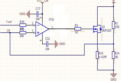 当Uf<Vref时,运放减小输出,MOS管导通程度减小,使得MOS管输出回路上的电压升高,最终维持在一恒定的值。