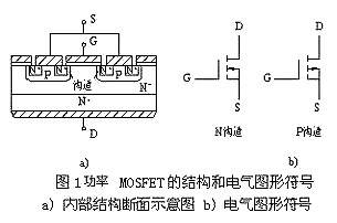 功率MOSFET的内部结构和电气符号如图1所示;其导通时只有一种极性的载流子(多子)参与导电,是单极型晶体管。导电机理与小功率mos管相同,但 结构上有较大区别,小功率MOS管是横向导电器件,功率MOSFET大都采用垂直导电结构,又称为VMOSFET(Vertical MOSFET),大大提高了MOSFET器件的耐压和耐电流能力。