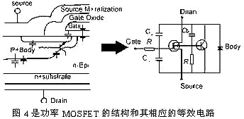 图4是功率MOSFET的结构和其相应的等效电路。除了器件的几乎每一部分存在电容以外,还必须考虑MOSFET还并联着一个二极管。同时从某个角度 看、它还存在一个寄生晶体管。(就像IGBT也寄生着一个晶闸管一样)。这几个方面,是研究MOSFET动态特性很重要的因素。