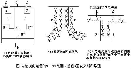 以上两种办法不能降低高压MOSFET的导通电阻,所剩的思路就是如何将阻断高电压的低掺杂、高电阻率区域和导电通道的高掺杂、低电阻率分开解决。如除 导通时低掺杂的高耐压外延层对导通电阻只能起增大作用外并无其他用途。这样,是否可以将导电通道以高掺杂较低电阻率实现,而在MOSFET关断时,设法使 这个通道以某种方式夹断,使整个器件耐压仅取决于低掺杂的N-外延层。基于这种思想,1988年INFINEON推出内建横向电场耐压为600V的 COOLMOS,使这一想法得以实现。内建横向电场的高压MOSFET的剖面结构及高阻断电压低导通电阻的示意图如图5所示。