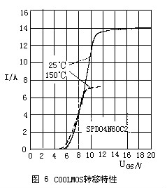 COOLMOS的最大特点之一就是它具有短路安全工作区(SCSOA),而常规MOS不具备这个特性。 COOLMOS的SCSOA的获得主要是由于转移特性的变化和管芯热阻降低。COOLMOS的转移特性如图6所示。从图6可以看到,当VGS>8V 时,COOLMOS的漏极电流不再增加,呈恒流状态。特别是在结温升高时,恒流值下降,在最高结温时,约为ID25℃的2倍,即正常工作电流的3-3.5 倍。在短路状态下,漏极电流不会因栅极的15V驱动电压而上升到不可容忍的十几倍的ID25℃,使COOLMOS在短路时所耗散的功率限制在 350V×2ID25℃,尽可能地减少短路时管芯发热。管芯热阻降低可使管芯产生的热量迅速地散发到管壳,抑制了管芯温度的上升速度。因 此,COOLMOS可在正常栅极电压驱动,在0.6VDSS电源电压下承受10ΜS短路冲击,时间间隔大于1S,1000次不损坏,使COOLMOS可像 IGBT一样,在短路时得到有效的保护。