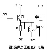 功率MOSFET属于电压型控制器件,只要栅极和源极之间施加的电压超过其阀值电压就会导通。由于MOSFET存在结电容,关断时其漏源两端电压的突然 上升将会通过结电容在栅源两端产生干扰电压。常用的互补驱动电路的关断回路阻抗小,关断速度较快,但它不能提供负压,故抗干扰性较差。为了提高电路的抗干 扰性,可在此种驱动电路的基础上增加一级有V1、V2、R组成的电路,产生一个负压,电路原理图如图8所示。