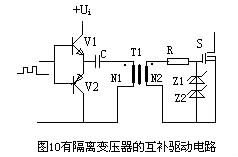如图10所示,V1、V2为互补工作,电容C起隔离直流的作用,T1为高频、高磁率的磁环或磁罐。