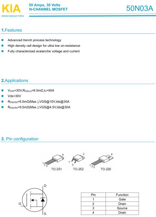 安定器MOS管 50N03 50A/30V规格书-防反接产品 12V输入方案-KIA MOS管