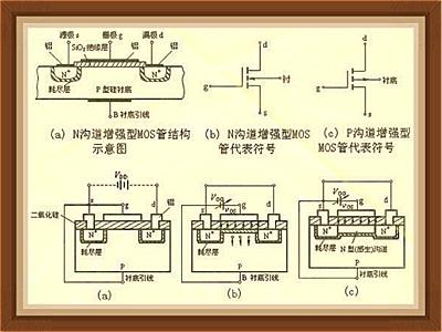 在一块掺杂浓度较低的P型硅衬底上,制造两个高掺杂浓度的N+区,并用金属铝引出两个电极,别离作漏极d和源极s。然后在半导体外表掩盖一层很薄的二氧化硅(SiO2)绝缘层,在漏——源极间的绝缘层上再装上一个铝电极,作为栅极g。在衬底上也引出一个电极B,这就构成了一个N沟道增强型MOS管。MOS管的源极和衬底通常是接在一同的(大多数管子在出厂前已联接好)。它的栅极与其它电极间是绝缘的。图(a)、(b)别离是它的构造示意图和代表符号。代表符号中的箭头方向标明由P(衬底)指向N(沟道)。P沟道增强型MOS管的箭头方向与上述相反,如图(c)所示。