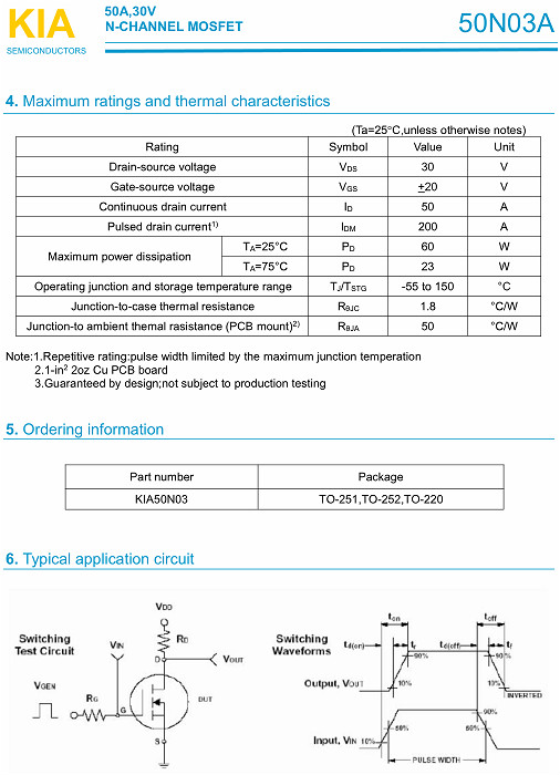 KIA50N03A替代NCE3050 50A/30V 封装齐全 规格书下载-KIA MOS管