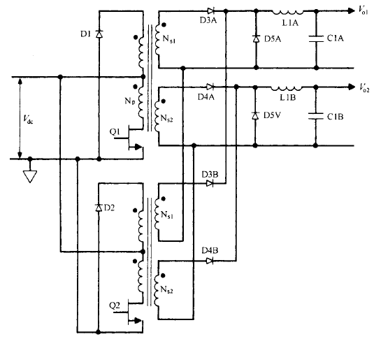 不过至今仍不很肯定 , 在输入和负载失常的 瞬态情况下 ,推挽拓扑的磁通不平衡问题能否完好能处置 。没有磁通不平衡问题可能是运用交错正激变换器的最好理由 。 在较少见的直流输出电压超越 200V 的场所,同样的输出功率下 ,选用交错正激变换器比选用单个正激变换器更合理 。单个正激变换器输出续流二极管( D5A 或 D5B ) 承受的反向 电压峰值为交错正激变换器的两倍 。