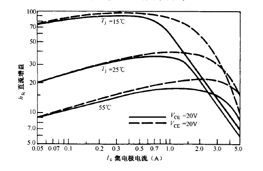 图 9.13 双极型晶体管的直流增益曲线 。双极型晶体管的增益随着输出电流的增大而减小 ,而MOSFET 管不存在这种情况 ,MOSFET 管最大电流只受结点温升的限制