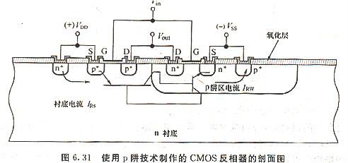 CMOS电路的阱结构最主要的问题在于闩锁现象,闩锁是由阱结构中寄生的pn—p-n二极管作用所造成的,如图6.3】所示,寄生的p—n-I,一n二极管是由一横向的p-n-p及一纵向的n-p-n双极型晶体管所组成的.p沟道MOSFFT的源极、n衬底及p阱分别为横向p-n-p双极型晶体管的发射极、基极及集电极;n沟道MOSFET的源极、p阱及n衬底分别为纵向n-p-n双极型晶体管的发射极、基极及集极其寄生部分的等效电路如图6.32所示.凡及Rw分别为衬底及阱中的串联电阻.每一晶体管的基极是由另一晶体管的集电极所MOS管驱动,并形成一正反馈回路,其架构就如第5章中所讨论的可控硅器件( thyristor).闩锁发生于两个双极型晶体管的共射电流增益乘积大于l时.当发生闩锁时'一大电流将由电源供应处(Vpo)流向接地端,导致一般正常电路工作中断,甚至会由于高电流散热的问题.而损坏芯片本身.
