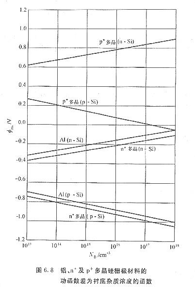 半导体的功函数坤;为费米能级至真空之间的能量差(图6,2),随掺杂浓度而有所变化,对于一有固定功函数qm的特定金属而言,我们预期其功函数差为qms-q(m一s),因此将会随着半导体的掺杂浓度而改变.铝为最常用的金属之一,其qm=4.leV.另一种广泛使用的材料为高掺杂的多晶硅n-与p+多晶硅的功函数分别为4. 05eV与5.05 eV.图6.8表示在浓度变化下,铝、n+多晶硅、p+多晶硅等与硅间的功函数差,值得注意的是,随着电极材料与硅衬底掺杂浓度的不同,ms可能会有超过2V的变化。