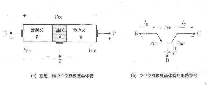 实亿国际 图5.2(a)为理想的一维结构p-n-p双极型晶体管,具有二段不同掺杂浓度的区域,形成两个p-n结,浓度最高的p+区域称为发射区(在图5.2中以E定义);中间较窄的n型区域,其杂质浓度中等,称为基区(base,定义为B),基区的宽度需远小于少数载流子的扩