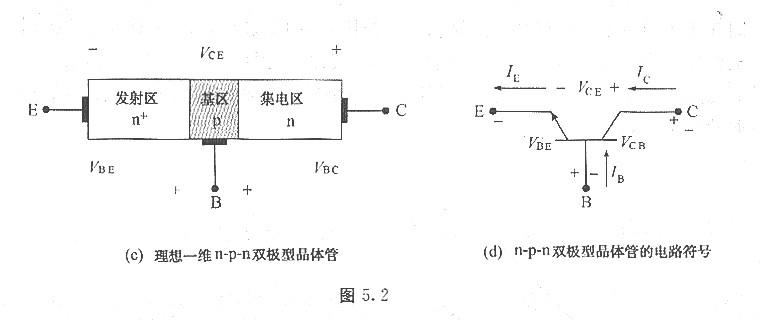 n-p-n双极型晶体管的结构与p-n-p双极型晶体管是互补的,图5.2(c)与图5.2(d)分别是理想p-n-p晶体管的结构与电路符号。将p-n-p双极型晶体管结构中的p换成n、n换成p,即为n- p-n双极型晶体管的结构,因此电流方向与电压极性也都相反.在下一小节中,我们将仔细讨论p-n-p双极型晶体管,因为其少数载流子(空穴)的流动方向与电流方向相同,可更直观地了解电荷运动的机制,只要了解了p- n-p晶体管,我们只要将极性和掺杂类型调换,即可描述n-p-n晶体管