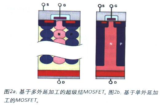 图2‘给出了早期超级结器件的结构,传统上它一直使用多外延工艺制造。丰富的N区域掺杂说明其比传统平面晶体管有着了更低的电阻.P型区包围N沟道的架构可以实现所需的击穿电压。