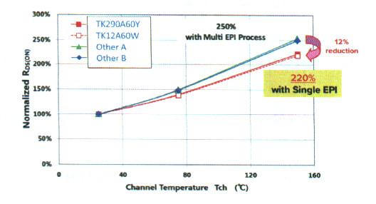 单外延工艺也使超级结MOSFET对温度变化时有着更稳定的性能,这有助于在更高工作温度时维持功率变换器的效率。图3说明了采用最新一代技术使器件标称导通电阻在温度变化显著时减少,在150℃时导通电阻降低了12%。