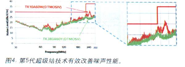 实亿国际 这种器件产生的噪声可与其他与之竞争的低EMI器件相媲美,同时该器件具有超级结技术的优越导通电阻特性。图4中比较了用于电视机电源中的PFC电路的第4代和第5代N沟道o.38m.Ω级600V器件产生的EMI.从结果看出新技术的采用显著降低了干扰。