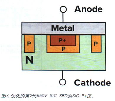实亿国际 为了增加浪涌电流能力,并为电源应用提供更强大的器件,我们在第1代架构已进行改进并减少了调制的电导率(采用二极管正向电压(VF)测试),从而实现更高的最大正向浪涌电流(IFSM).其中通过优化实现的P+区如图7所示。