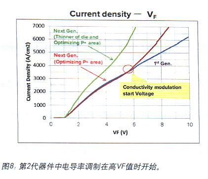改变二极管结构改善了电流密度和VF之间的关系,提高了奠电导率调制开始出现的电压,如8所示图。这样使器件有着较高IFSM.也使第2代架构的IFSM优于第1代器件。