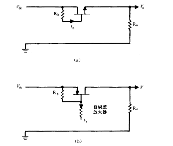 图1.3 (a)串接NPN型晶体管的线性调整器。若基极驱动由Vd,经Rb提供,则网压输入对应的纹波谷值电压与输出电压间必须存在最小压差以保证向内的基极驱动电流。(b)串接PNP型晶体管的线性调整器。使用PNP型晶体管时,所需基极电流不是取自Vd。,而是由基极向外流入电流放大器。Vd。不必比Va高2.5V,最小压差可以是0.5~I.OV串接PNP型晶体管的集成线性调整器现市场上有售,但价格很高。就集成电路制造工艺而言,在同样芯片上集成较大电流的PNP型晶体管比集成较小电流的NPN型晶体管更困难。
