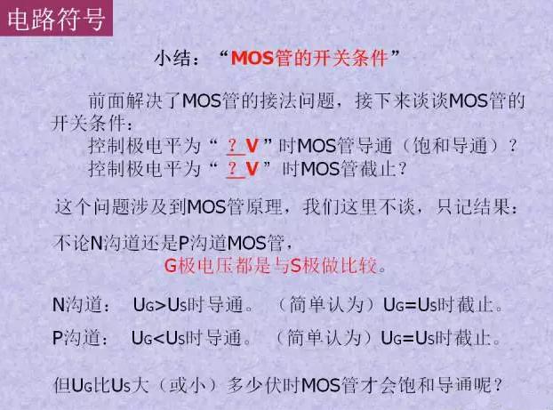 MOS管为压控元件,你只要加到它的压控元件所需电压就能使它导通,它的导通就像三极管在饱和状态一样,导通结的压降最小.这就是常说的精典是开关作用.去掉这个控制电压经就截止. MOS管 MOS管的英文全称叫MOSFET(Metal Oxide Semiconductor Field Effect Transistor),即金属氧化物半导体型场效应管,属于场效应晶体管中的绝缘栅型。因此,MOS管有时被称为场效应管。在一般电子电路中,MOS管通常被用于放大电路或开关电路。而在主板上的电源稳压电路中,MOSFET扮演的角色主要是判断电位,它在主板上常用“Q”加数字表示。