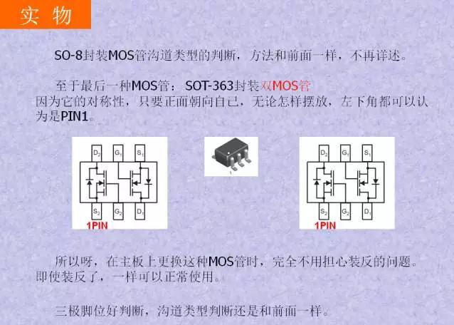 目前主板或显卡上所采用的MOS管并不是太多,一般有10个左右,主要原因是大部分MOS管被整合到IC芯片中去了。由于MOS管主要是为配件提供稳定的电压,所以它一般使用在CPU、AGP插槽和内存插槽附近。其中在CPU与AGP插槽附近各安排一组MOS管,而内存插槽则共用了一组MOS管,MOS管一般是以两个组成一组的形式出现主板上的。