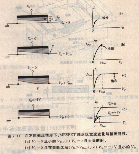 解MESFET的工作原理,我们考虑栅帔下方的部分,如图7.lo(b)所示.我们将源极接地,而栅极电压与漏极电压是相对源极测量而得.正常工作情形下,栅极电压为零或是被iju以反向偏医,而漏搬电压为零或是被加以正向偏压.也就是说'VG≤0而VD≥0.由于沟道为n型材料,此器件被称为n沟道MESFET.在大多数的应用中是采用n沟道MESFET而非p沟道MESFET,这是肉为n沟道器件具有较高的电子迁移率.