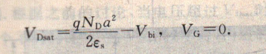 对n沟道MESFET而言,栅极电压相对于源极为负值,所以我们在式(26)以及其后的式子中,使用VG的绝对值.由式(26)可以看出,外加的栅极电压VG使得开始发生夹断时所需的漏极电压减小了VG的值为