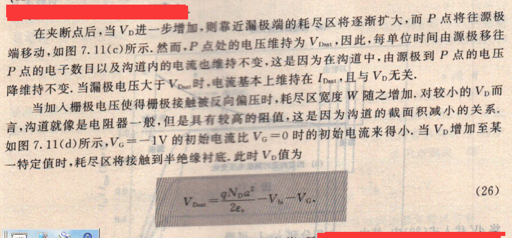 在此漏极电压时,源极和漏投将会被夹断(pinched off)或说是被反向偏压的耗尽区完全分隔开.图7,ll(b)中的位置P即称为夹断点,在此点有o个很大的漏极电流称为饱和电流(saturation current)IDsat,,可泣过耗尽区,这与注入载流子到双极猁品体管的集基结反向偏压时所形成的耗尽区的情形相似.