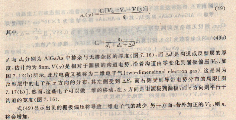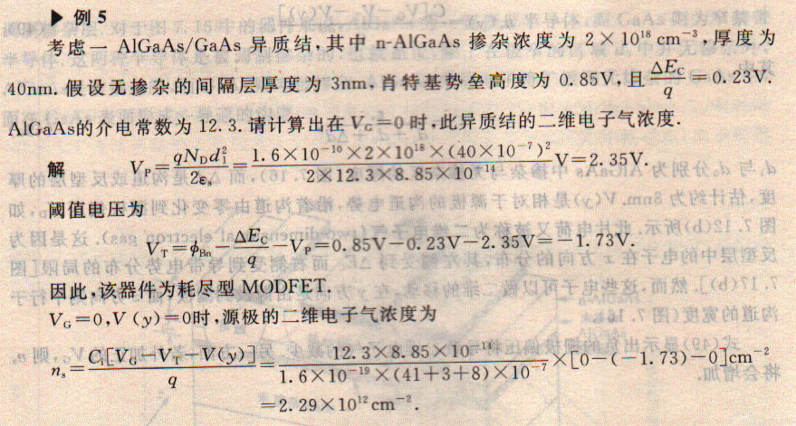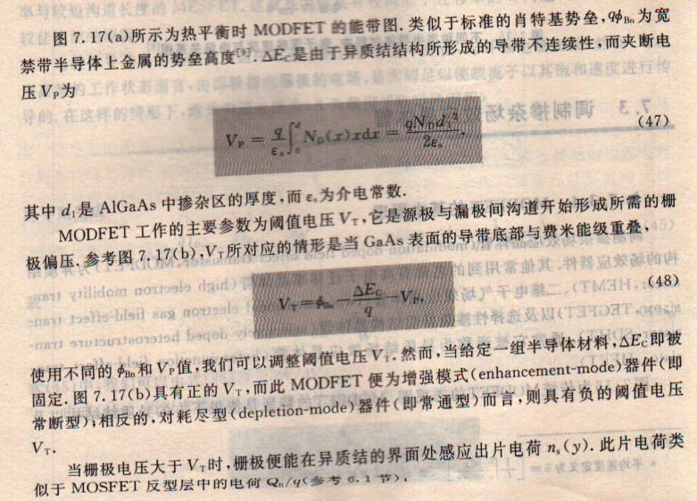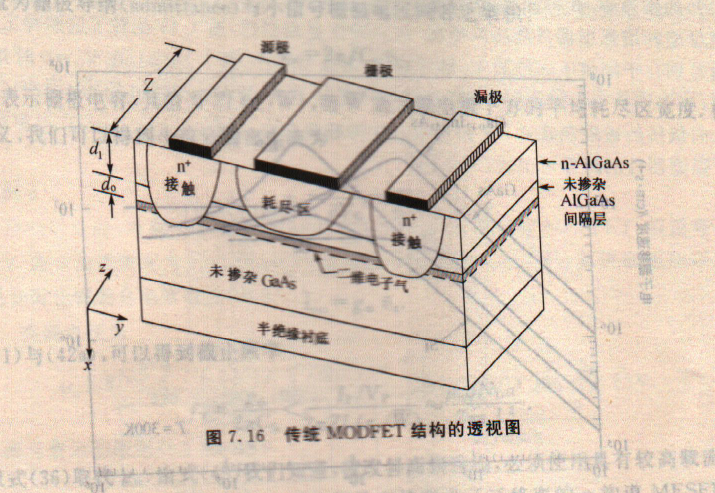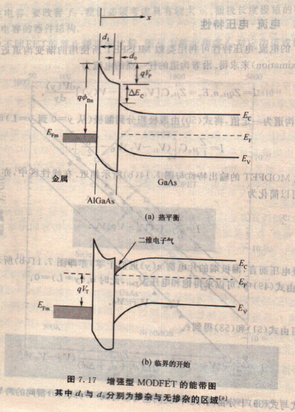 图7,1、6为传统MODFET的透视图.MODFET的特征是栅极下方的异质结结构以及调制掺杂层,对于图7:.16中的器件来说.AIGaAs为一宽禁带半导体,而GaAs则为窄禁带半导体.这两种半导体是被调制掺杂的,也就是说,除了在极窄的区域如中并无掺杂外
