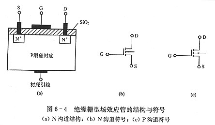 绝缘栅型场效应管的特性是输人电阻高,便于做成集成电路。在一块N型硅片上有两个相距很近浓度很高的P扩散区,分别为源极和漏极。在源区与漏区之间的硅片上,有一层绝缘二氧化硅,绝缘层上掩盖着金属铝,这就是栅极。栅极和其他电极之间是绝缘的,所以称为绝缘栅型场效应管。由于源、栅之间有一层氧化层,这种管子根本上没有栅极电流,因而输入阻抗十分高。图6-4所示为绝缘栅型场效应管的构造与场效应管符号。
