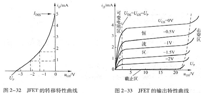 由此可见,结型MOS场效应管转移特性曲线是用来阐明在一定的漏源电压u陌时,栅源电压UGS和漏极电流iD之间变化关系的曲线。JFET的转移特性曲线如图2-32所示。