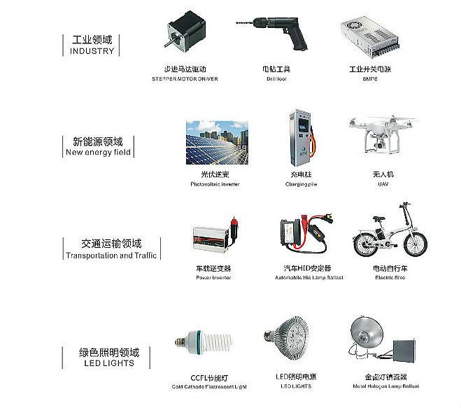 在移动数码,LCE,HID,LED,电动车,开关电源,逆变器,节能灯等领域深得客户认可。