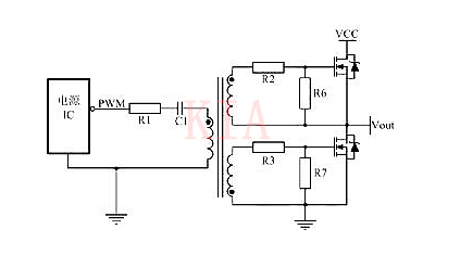 为了满足如图 5所示高端MOS管的驱动,经常会采用变压器驱动,有时为了满足安全隔离也使用变压器驱动。