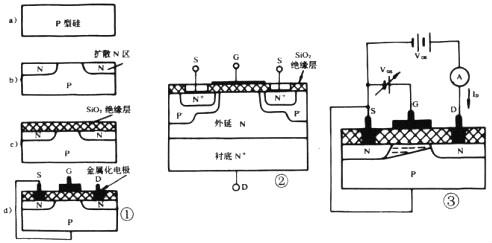 图1是典型平面N沟道增强型MOSFET的剖面图。它用一块P型硅半导体材料作衬底(图la),在其面上扩散了两个N型区(图lb),再在上面覆盖一层二氧化硅(SiQ2)绝缘层(图lc),最后在N区上方用腐蚀的方法做成两个孔,用金属化的方法分别在绝缘层上及两个孔内做成三个电极:G(栅极)、S(源极)及D(漏极),如图1d所示。