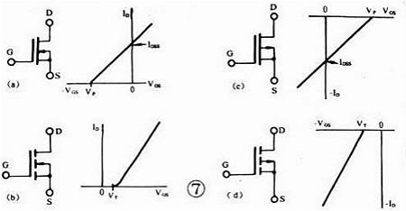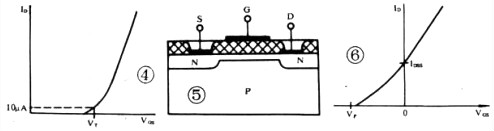 由于这种结构在VGS=0时,ID=0,称这种MOSFET为增强型。另一类MOSFET,在VGS=0时也有一定的ID(称为IDSS),这种MOSFET称为耗尽型。它的结构如图5所示,它的转移特性如图6所示。VP为夹断电压(ID=0)。