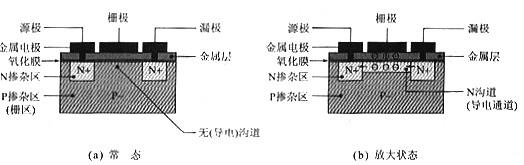 在常态下,MOSFET中并没有导电通道,在有了偏置电压时,在电场的作用下,源极(区)与栅极(区)之间就会形成导电通道,并且随着偏置电压的增加而加宽,导电能力增加直到最大(饱和导通)。这种MOSFET称为增强型MOS管(Enhancement-Mode MOSFET),这是目前为止应用最为广泛的MOSFET,尤其是功率MOSFET和CMOS IC。PMOS和NMOS -般也是指增强型的MOSFET。