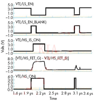 在图2中,信号的第一栏(左边)表示正常运行。信号名对应图1。当HS_ON走高,命令驱动器开启HS FET时,HS_FET_G-HS_FET_S升高。监测电路探测到后,正确地显示HS_IS_ON从而关闭LS FET(LS_EN为低值),直到HS FET完全关闭之后(HS_FET_G-HS_FET_S 接近零)。