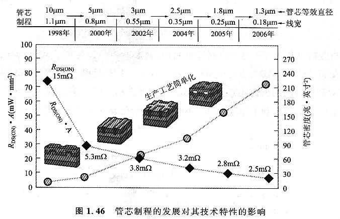 一个相对客观的办法是将管芯面积的要素思索进来,将管芯面积A与RDS(ON)相乘,得到一个名为“本征电阻”的参数以减少电流规格的影响(图1.46)。本征电阻小,就意味着要么电流规格很高,要么适用的开关频率很高。另一方面,管芯制程(芯片的设计与制造规程)的开展使管芯单元的密度逐步提高,也有利于管芯的小型化。在功率半导体方面,耗散功率会限制管芯制程的进一步减小,这方面还是滞后于小功率IC的。