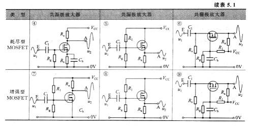 从表中也不难看出,不同组态的电路,偏置电路也有所不同。表5.1中的①为自偏压,相似的还有④,自偏压不适用于增强型器材,由于这类器材的敞开电压不是从0开端的;②为分肤偏压,也称为混合偏压,是最常用的一种,除了①、④之外均为分压偏压方法。