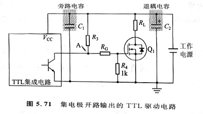 TTL集成电路的逻辑电平为5V,输出级通常由BJT(双极性晶体管)组成,信号普通从集电极输出,这就是常说的“集电极开路输出”,当然,输出级也有采用MOSFET的,这就是“开漏输出”。上述开路输出方式需求外部电路配置偏置电阻,以树立工作点,限定输出电流(图5.71)。