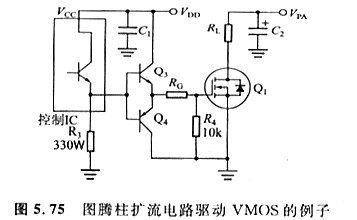 采用TTL集成电路驱动MOS另一个需求留意的问题是,工作电压至少要高于VMOS的开启电压VGS(th),而且要保证图中A点的驱动电压高于开启电压。用CMOS来驱动根本上不需求思索这样的问题,由于此类Ic能够提供12V左右的信号电平(图5.72)。