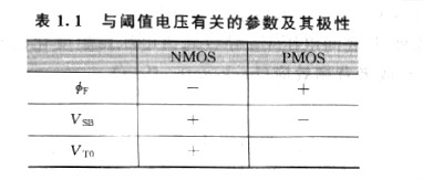 式中,q是电子电荷,1.6X 10-19[C];εsi是硅的相对介电常数,εsi= 11.7;Nsub是衬底(阱)的杂质浓度。γ越大,表示衬底偏置效应越强。关于NMOS和PMOS来说,与阈值电压有关的参数的极性是不同的,表1.1列出这些参数及其极性。