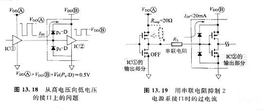 在接纳IC的电源电压比发送lC的电源电压低的场所,如图13.18所示,经过IC②的输入维护电路产牛的稳定电流IIH会导致器件劣化,所以不能够直接中止接口。针对这个问题,如图13. 19所示,采用给信号线插入串联电阻,抑止电流IIH的方法。