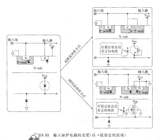 实亿国际 如图13. 21所示,用晶体管的击穿特性交流二极管的正向特性,去掉从输入到VDD线的电流途径。作为维护电路,也能够吸收比VDD线的电压电平更高的正的外来浪涌。当然,这个击穿电压应该设计得比IC内部的初级输入栅耐压低。