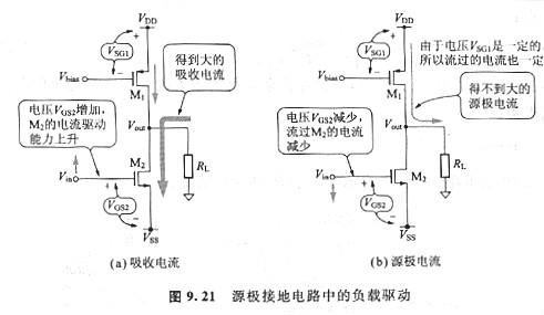 如图9.21(a)所示,当Vout降低,自RL流入输出端的电流(吸收电流)增加时,n沟MOS晶体管M2的栅极电压上升。就是说,VGS2增加,M2的电流驱动才干增强,能够流过大的吸收电流。