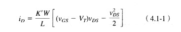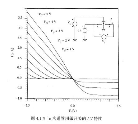 式(4.1-2)中的Q是晶体管的静态工作点。图4.1-3说明了n沟道管漏极电流随漏、源电压变化的曲线,其巾管子的宽长比WIL=5/1,VGS等间隔增加。此图说明了MOS管下作的一些重要原理。注意,图中的曲线并不是关于Vl=0对称的。这是因为晶体管端(漏、源)开关起着Vl过零的转换作用。例如,当VI为正时,B点是漏极,A点为源极,且VBS同定为-2.5V,VGS由给定的VG固定。当V1为负时,B点为源极,A点为漏极,且VI和VBS连续减少,而VGS增加,从而导致电流增加。