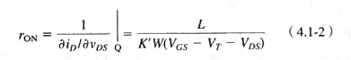 MOS技术的一个优点是可提供一个性能良好的开关。图4.1-2显示了一个MOS晶体管被用做开关的情况。它的性能可以由图4.1-1显示的MOS晶体管大信号模型构成的开关确定。可以看到,MOS晶体管的漏极或源极做端点A或o取决于端点电压(即,对n沟道管,如果A端电位高于B,那么A端是漏极,B端是源极)。导通电阻由rD、rs的组合与始终存在的沟道电阻串联组成。通常rD和rs的影响很小,所以主要考虑沟道电阻。沟道电阻的表达式可这样求得:在开关导通状态,开关两端的电压很小,且VGS很大。因此,MOS器件可以假设工作在非饱和区。式(3.1-1)重写如下以表示这个状态: